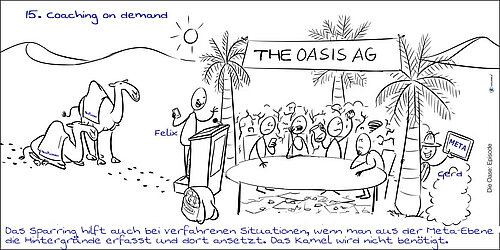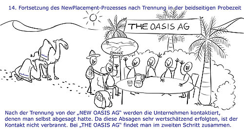 Storyboard : Gerd, le guide expérimenté dans le désert des candidatures, s'assoit avec Felix pendant toute une journée et crée une biographie pour comprendre les valeurs, les objectifs et les attitudes de Felix en matière de performance et d'expérience, ainsi que ses forces et ses faiblesses. Ce n'est qu'alors qu'il peut définir des objectifs et des pistes avec Félix et se mettre en route. Felix n'avait plus conscience des nombreuses "pièces d'or" de sa carrière professionnelle. Plein de confiance en lui, il est maintenant impatient de partir pour une nouvelle oasis avec Gerd. Le directeur Manfred part seul.